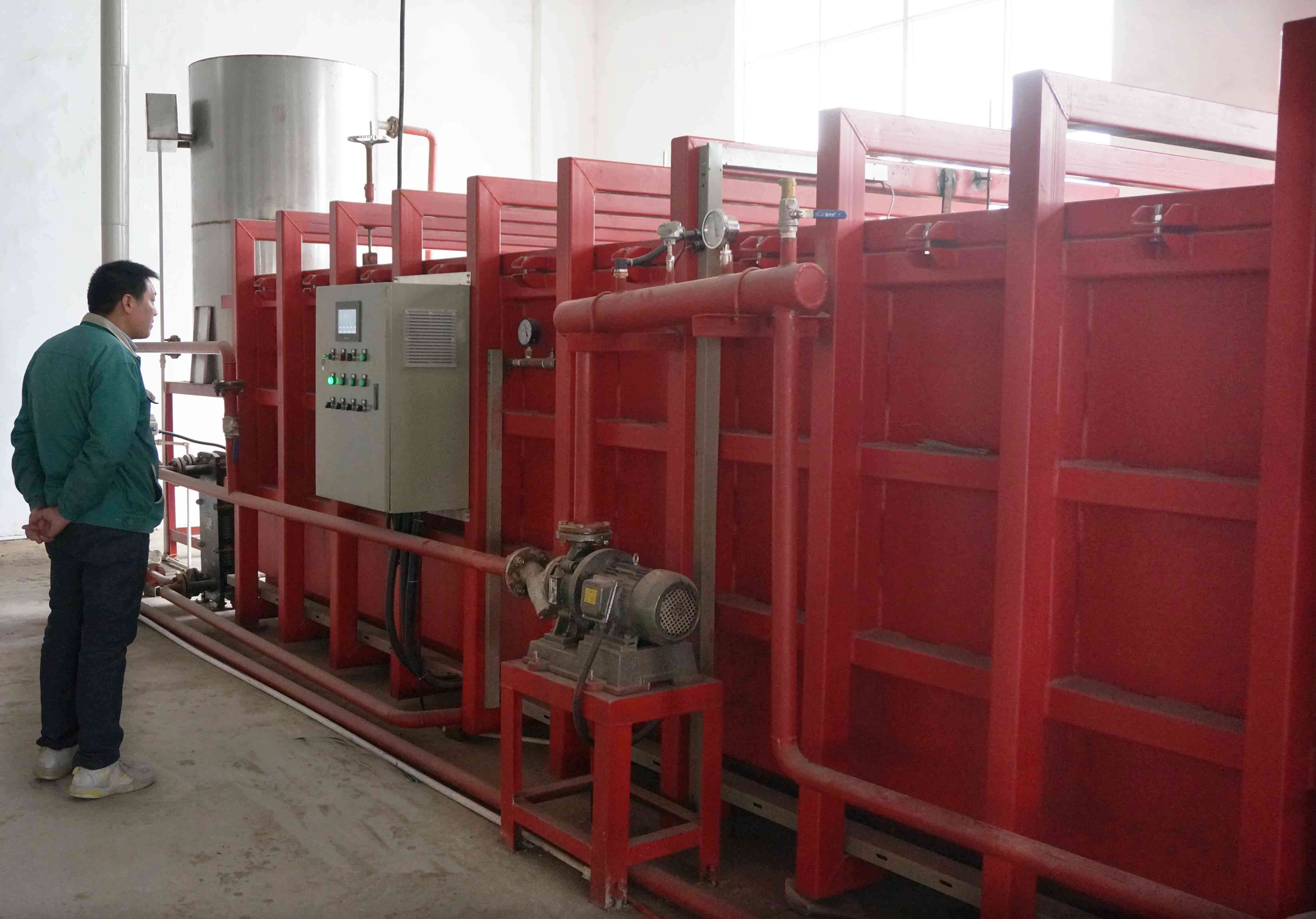 加熱系統(tǒng)由板式換熱器、循環(huán)管道、循環(huán)泵、快速接頭及高壓軟管、空心加熱鋁板等組成。由電動(dòng)閥門控制板式換熱器的換熱量,從而控制加熱系統(tǒng)中所需要的水溫,熱水流經(jīng)空心加熱鋁板,通過接觸加熱方式加熱木材。不銹鋼快速接頭及高壓軟管解決了裝載小車進(jìn)出箱體及裝材的問題。